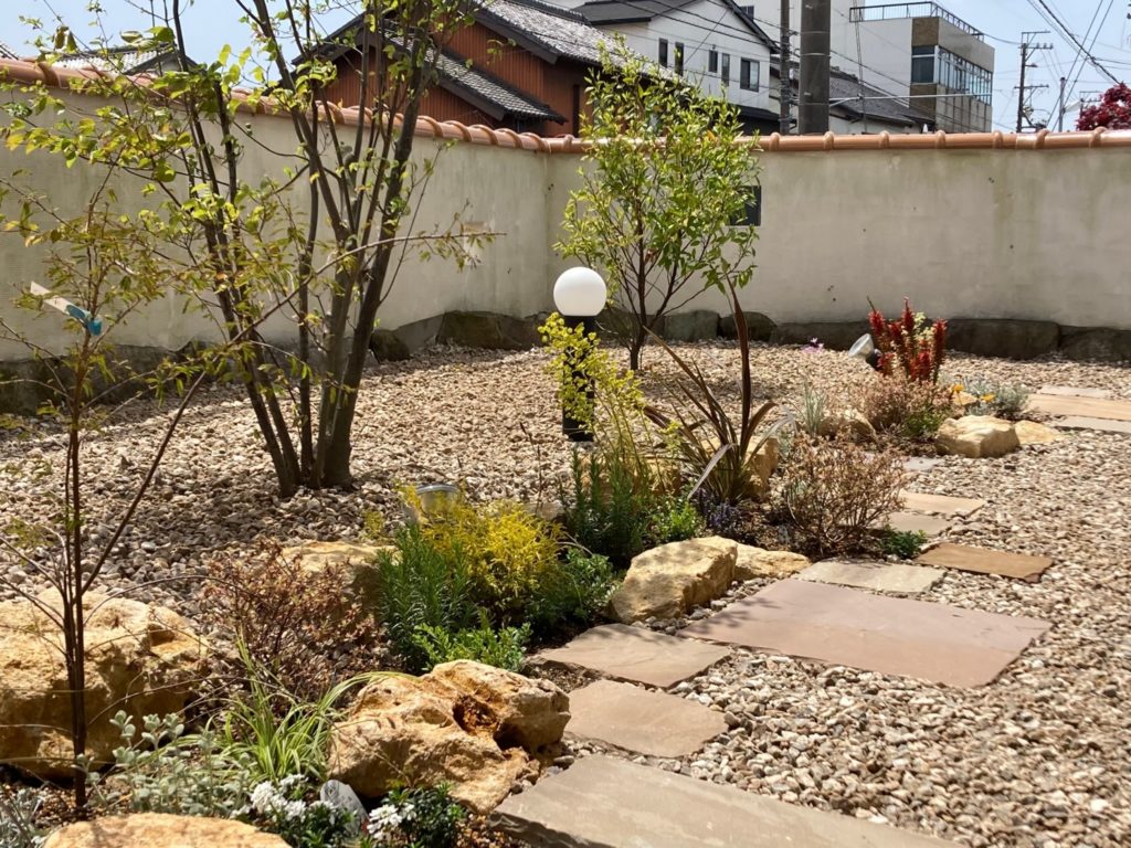 芝生を砂利に変えて、植栽帯は部分的に配置。管理がしやすく雰囲気も良いお庭になりました。