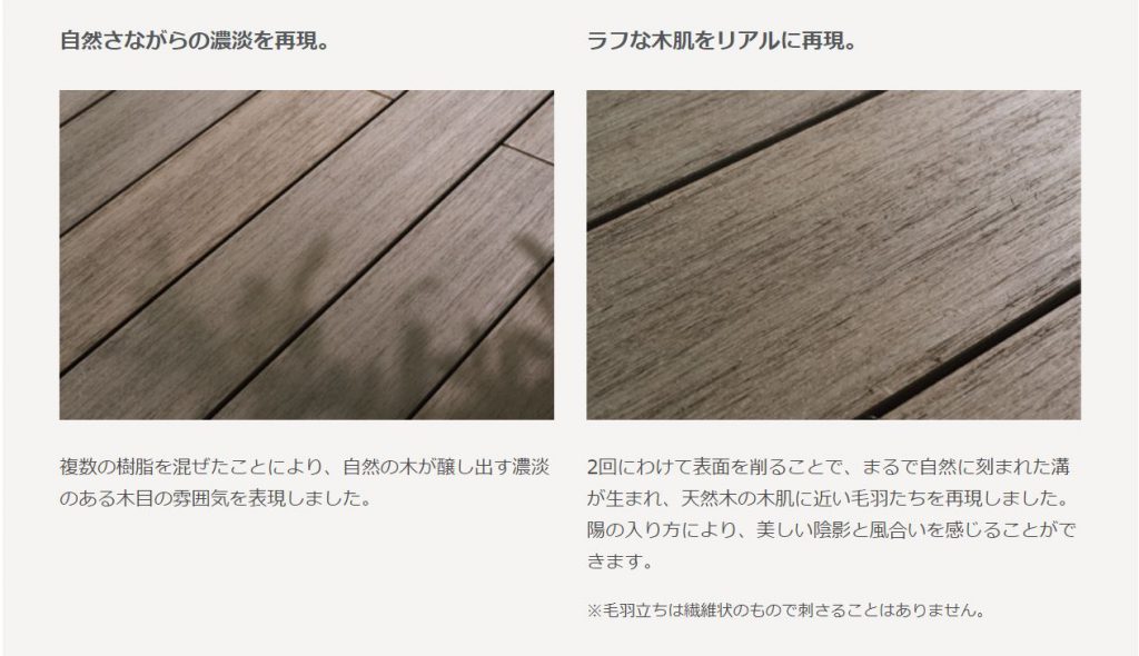 この2つのポイントによって、自然界にある色が均一ではないように、1本1本の床板に濃淡の色ムラをもたせ、デッキ全体に心地良い“ゆらぎ”を生み出しています。この“ゆらぎ”が天然素材の外装材や植栽にも調和するヴィンテージな風合いを演出しているのです。