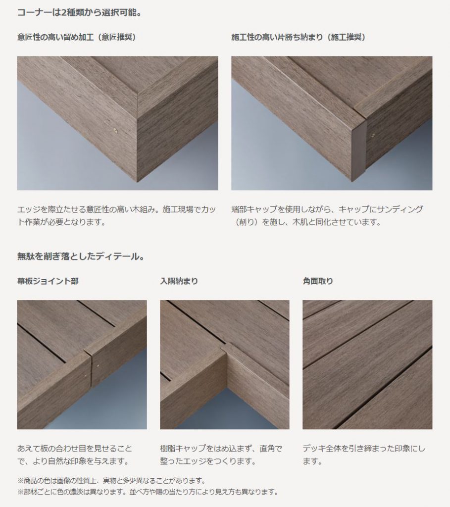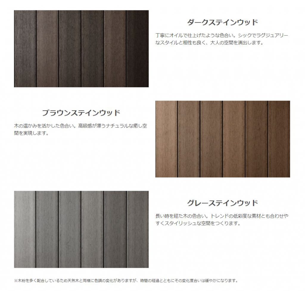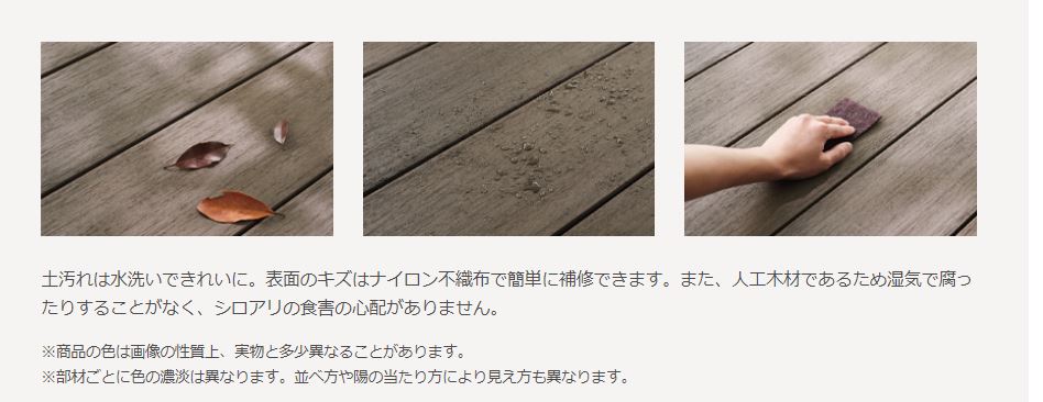 - 人工木材であるためメンテナンスフリーなのに天然木のような味わいを楽しめる。