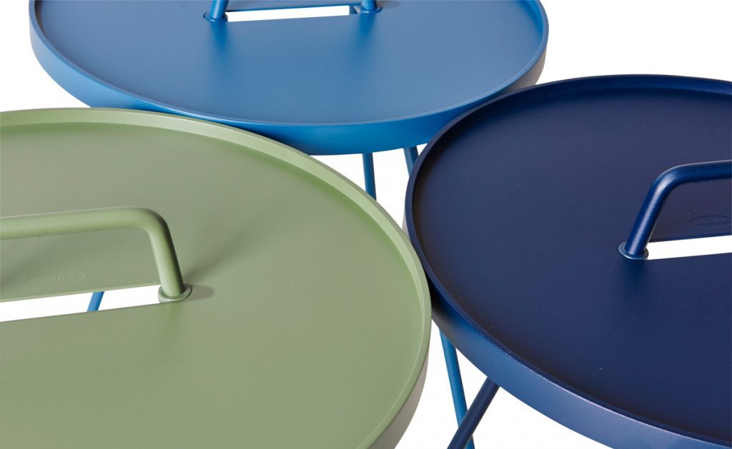 カラー展開が豊富でサイズも2サイズあるのでいろいろなシーンで使いやすく、景色の中の差し色としてもお洒落です。天板はトレイとしてもつかえ、取っ手があるので持ち運びも便利です。