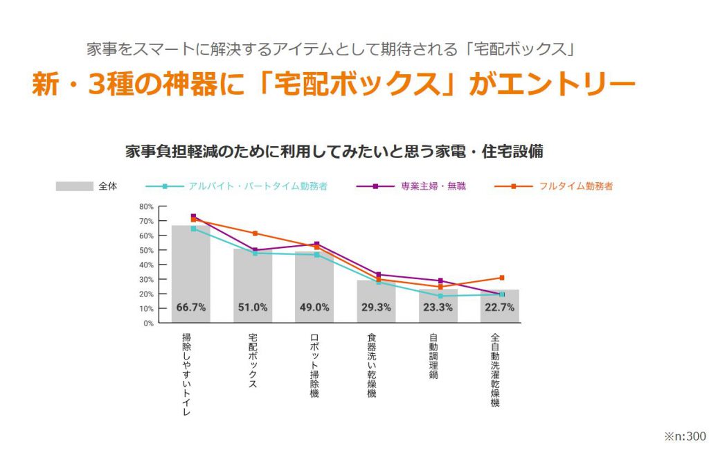 では新・三種の神器とは何かというと、分類の仕方などによって諸説ありますが、特にロボット掃除機・食器洗い乾燥機・薄型テレビ・携帯電話…などがよくあげられています。そしてその中に宅配ボックスも入っているのです。