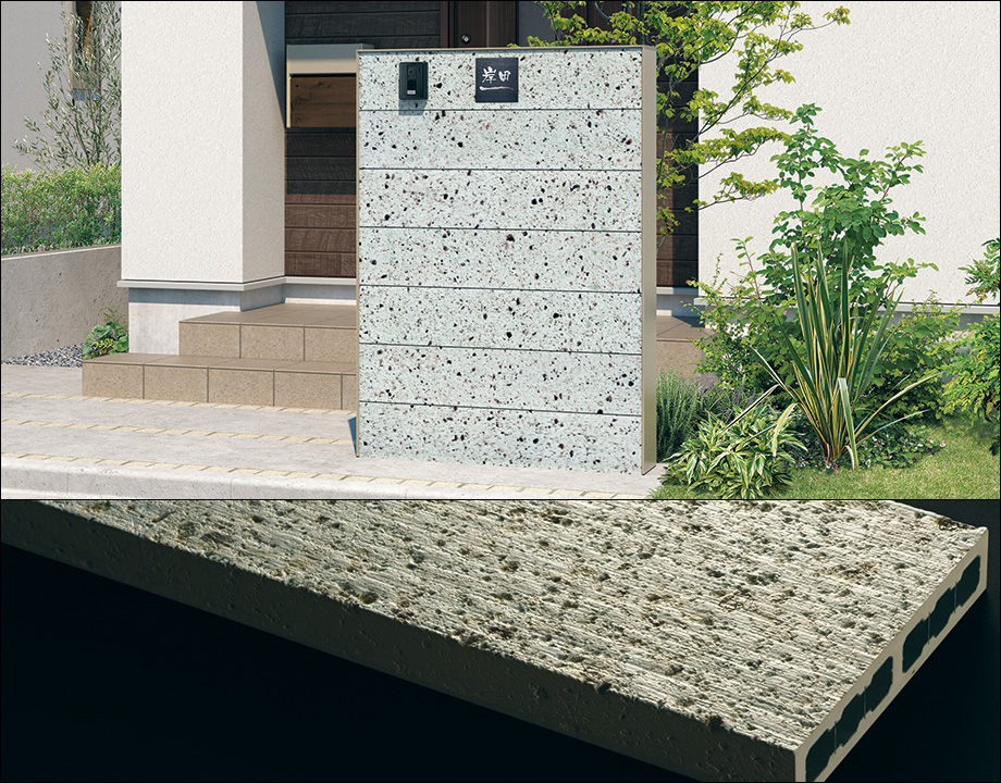 リアリティを追求した見た目で、住宅から公共施設まで、多彩な場面で活躍する商品です。テクスチャーシートをラッピングした壁材で、アルミとプラスチックの複合材のため軽量なユニット塀が実現します。