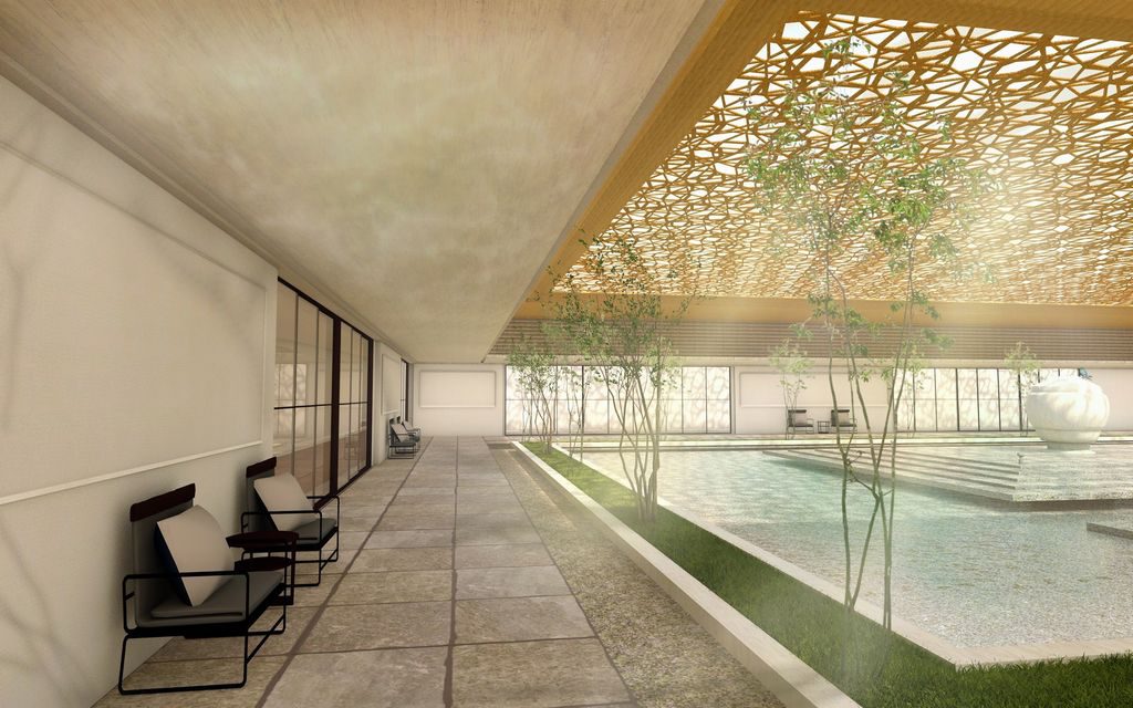 ぱっと見の要素はシンプルながらも、光と水の表現にはこだわっています。明るい空間だからこそできる陰影や、水面が反射して輝く天井の映り込みなど、試行錯誤してここまでたどり着きました。