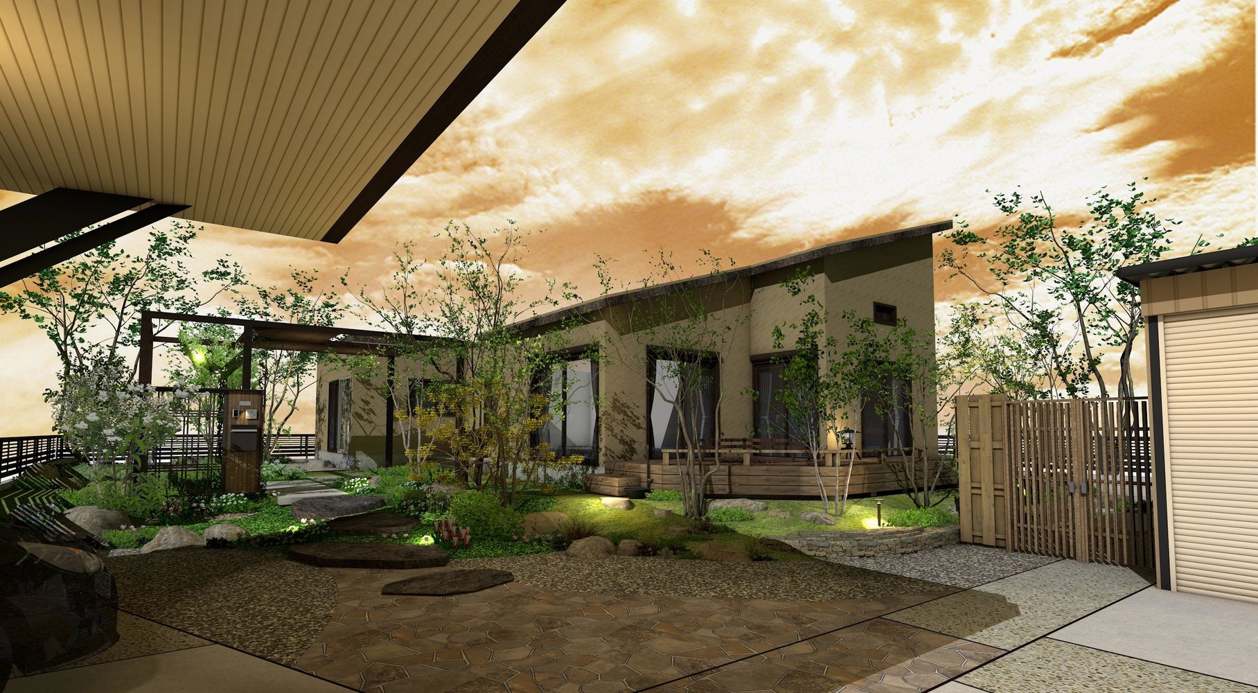 エクステリア奨励賞をいただいた『日暮れの情景』をご案内します。最近人気の高まる和モダン外構を意識しデザインしました。