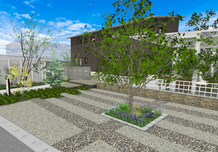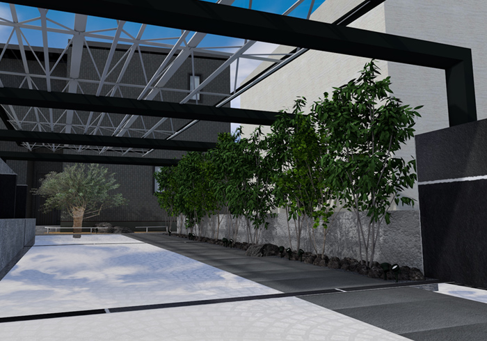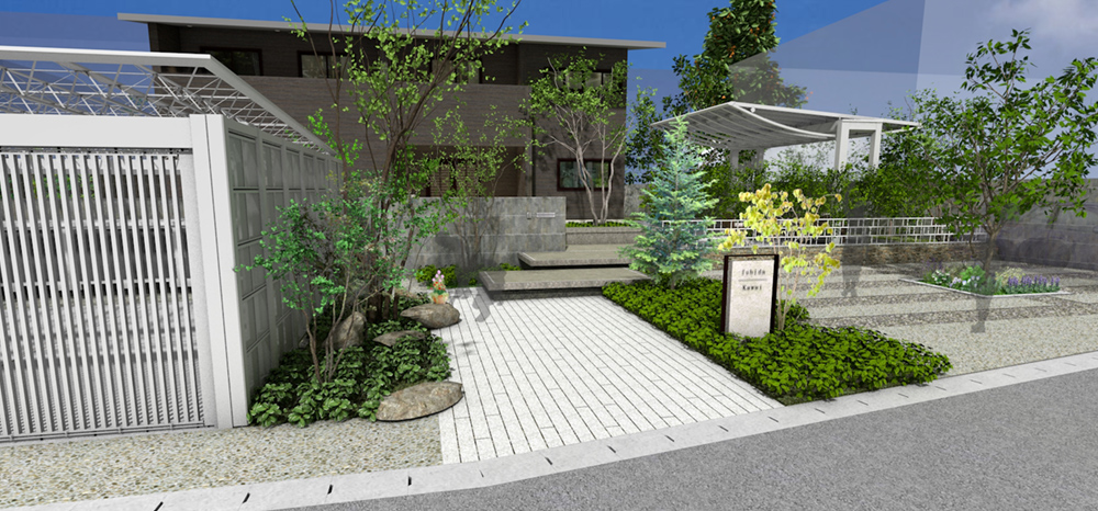 門まわりのフレームは水平ラインを強調することで平屋建ての住まいと調和するとともに、門構えから感じる格式の高さを印象付けます。