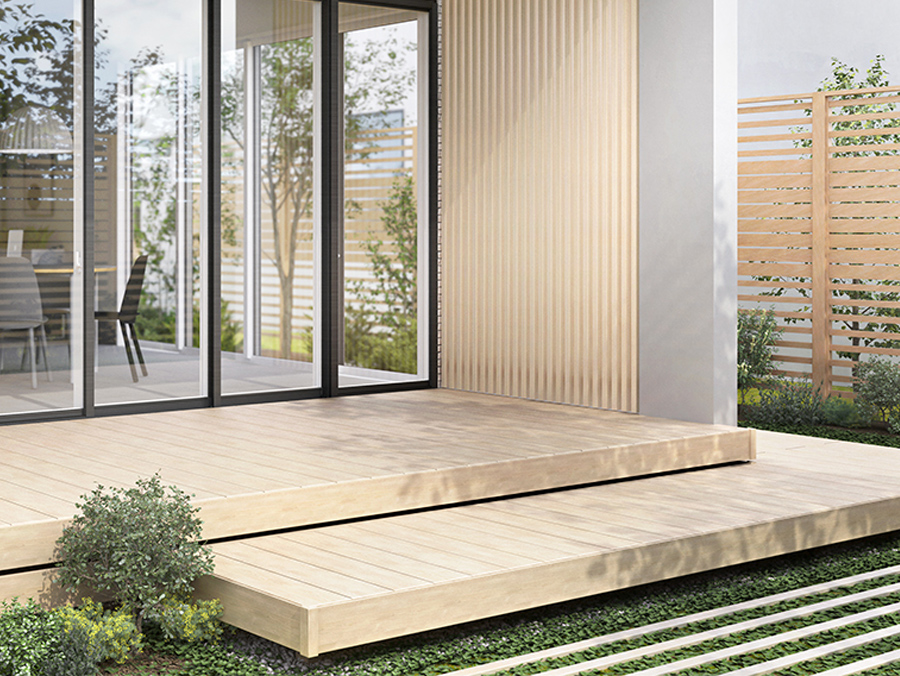 自然な風合いのリアルな人工木材を中心に作り上げるナチュラルな印象のデザインです。劣化しにくく、デザイン・施工性・メンテナンスに優れたアイテムを中心に選びました。