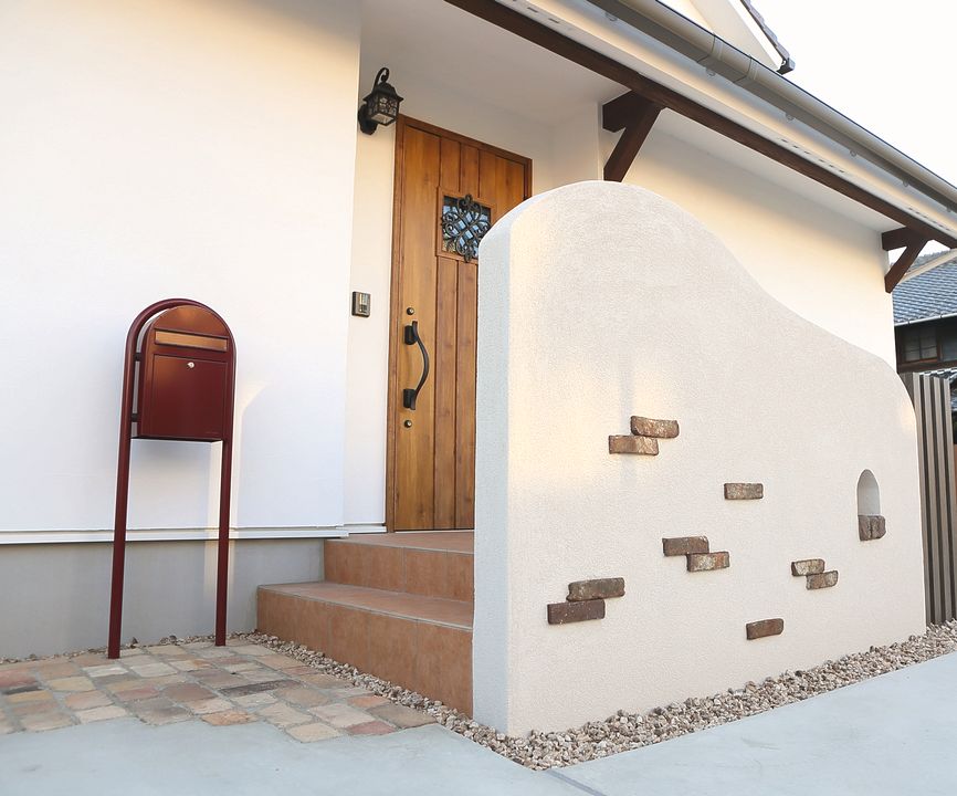 全体的に暖色と少しダークなカラーを選ぶことで、落ち着いた可愛らしい雰囲気をつくり、ポストやアプローチでは曲線や素材の温かみを活かした南欧スタイルの門まわりとなりました。