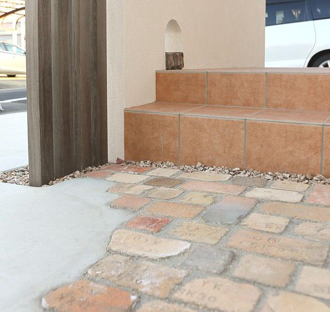 道路に面している玄関は、小さいお子様が急に飛び出したりしないように門壁が安全柵の役割を果たしています。同時に、扉を開けたときに室内が見えないようにもなっています。最も目を引く部分ですので、天端の曲線加工や飾り窓加工、壁用レンガのワンポイントなど工夫をしています。