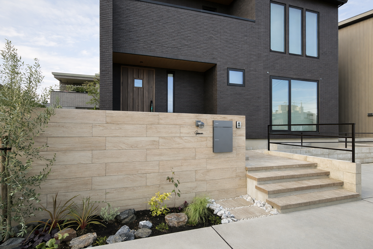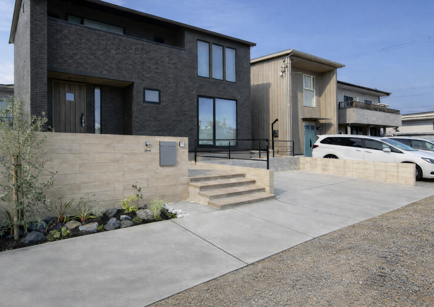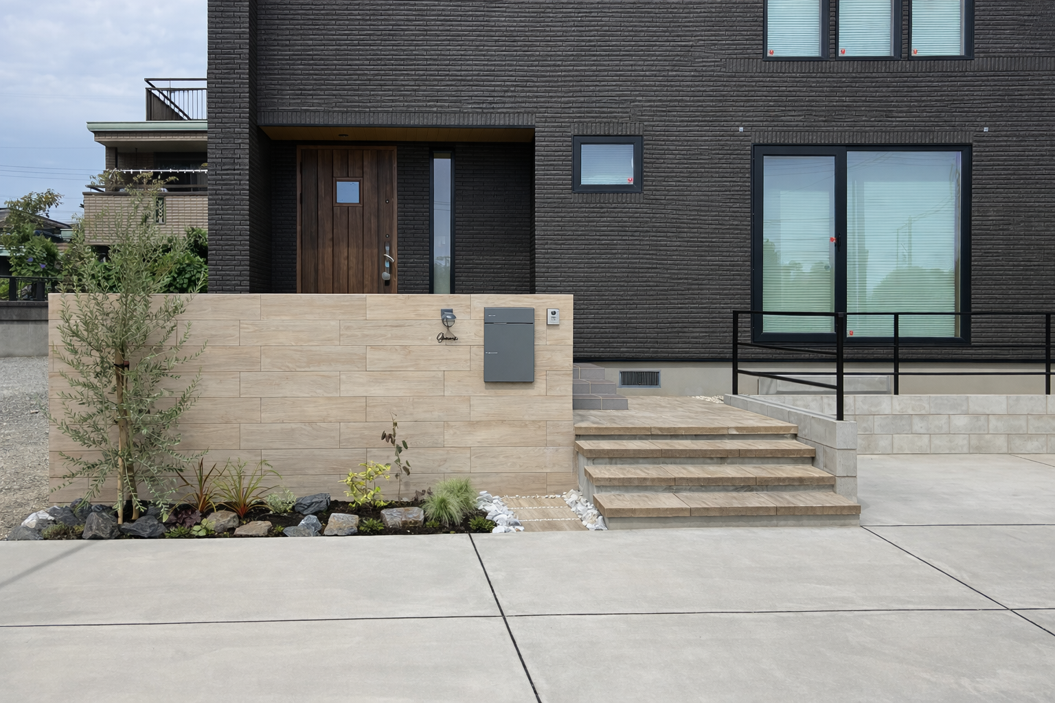 直線的で落ち着いた建物デザインに合わせ、素材感と配置バランスにこだわったモダンナチュラルな外構です。