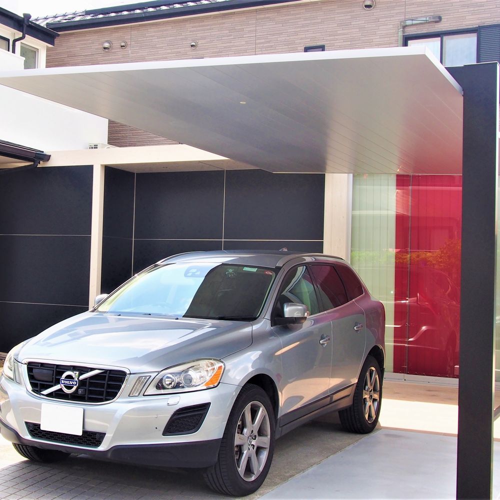 駐車場は1台分のスペースにカーポートSCを施工しました。一見すると、玄関からは離れているのですが、すぐ後ろのオールグラスポーチを通っていけば、雨や雪の日でも濡れずに部屋までたどり着けます。