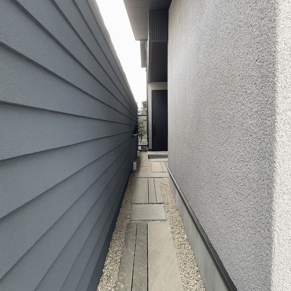 細長い通路にそびえ立つのは、グランドアートウォールという装飾壁です。ブロック積みより軽量な特殊発泡パネルを用いたユニット式の商品で、幅の狭い場所で高さのある壁を設置したいときに有効です。こちらの鎧壁仕上げ以外にも様々な左官・塗装が可能です。