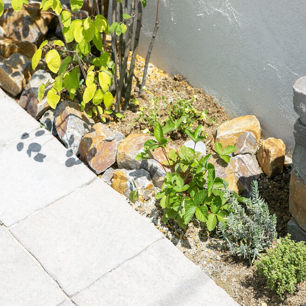 植栽の中に、石積みと同じ色味に合わせた大きめの砕石を部分的に敷いています。温かみのある茶色混じりの天然石で植物との相性も◎です。合わせて化粧砂利も茶色に統一しています。