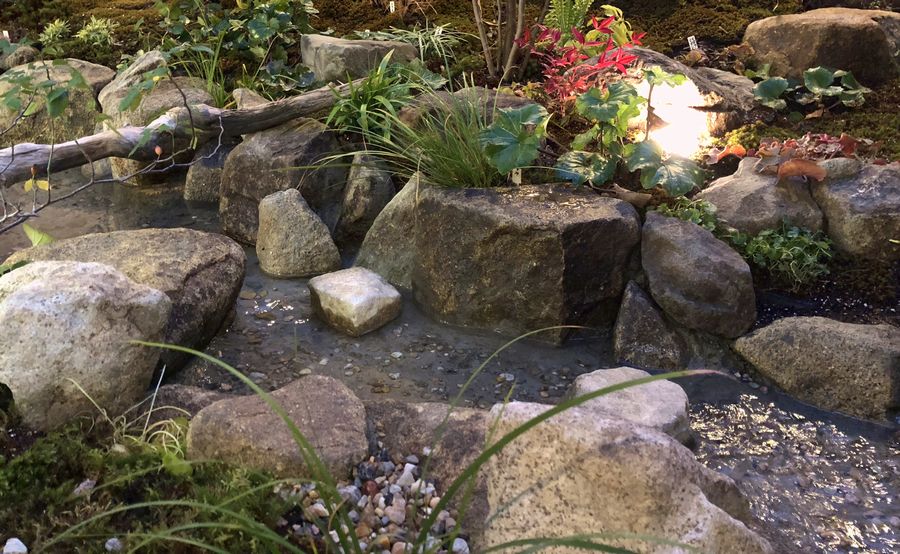 もともと中庭にあったインターロッキングのテラスを新しく作り変えるにあたり、「自然の中にいるような心落ち着く空間にしたい」というご要望をいただきました。山の中の源流をイメージして、小川の造作も行いました。