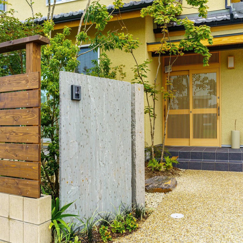 自然素材にこだわりたく、門壁には自然石の平板と角柱を設置しました。