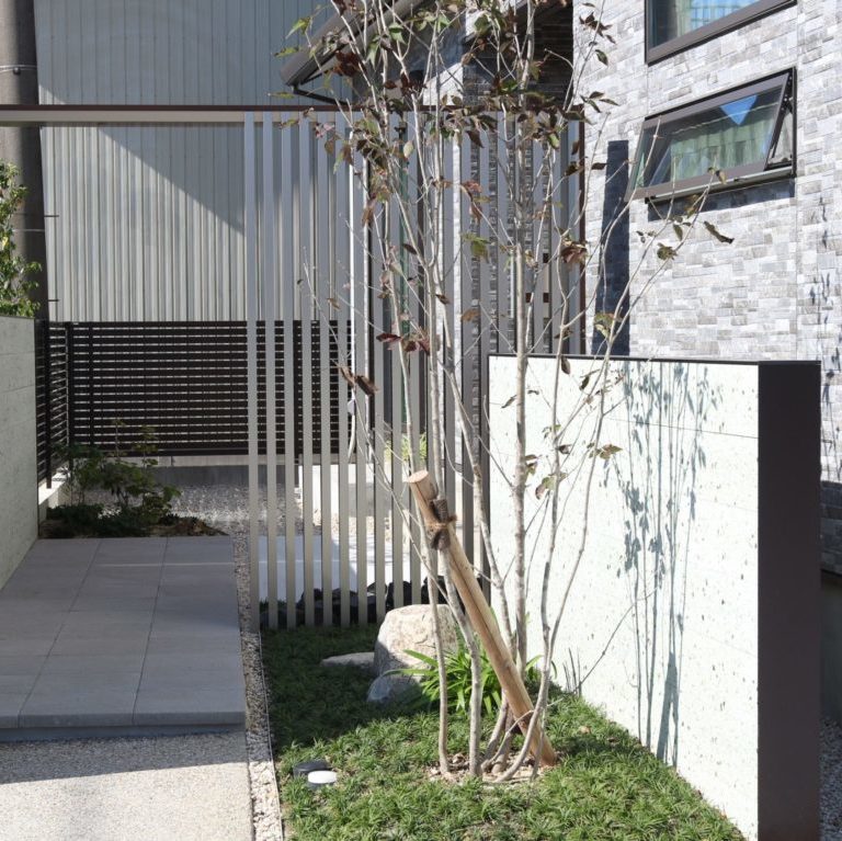 フレームを設けることで目隠しの一部とし、空間を視覚的、心理的にも区切られるので、境界と広さの演出をしました。