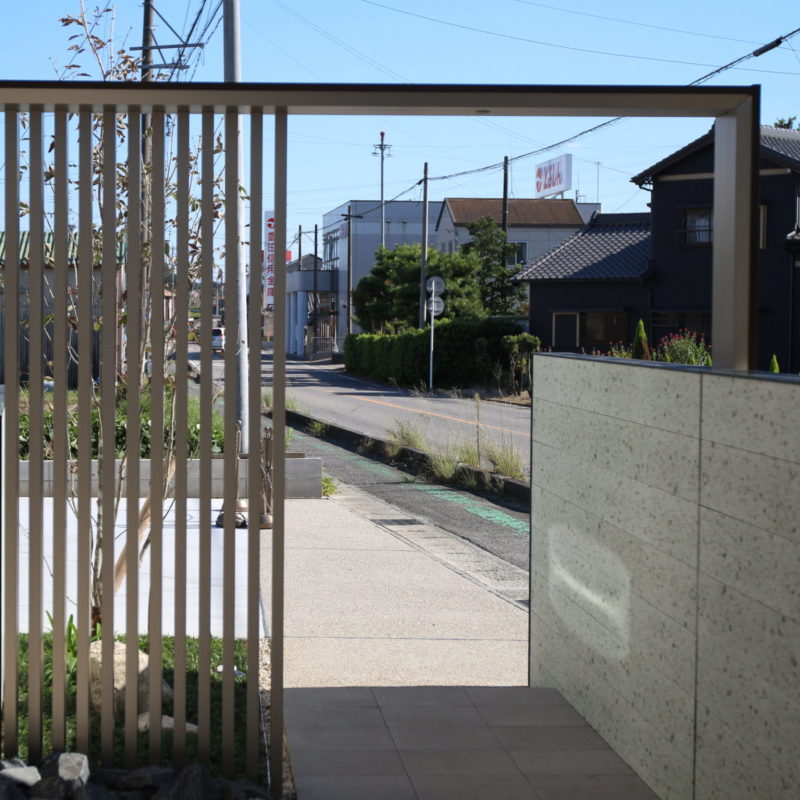 玄関まわりのプライバシーを守るめに、壁の設置を提案しました。施工と構造ともに安心・安全な美楽麗(みられ)を採用しています。
