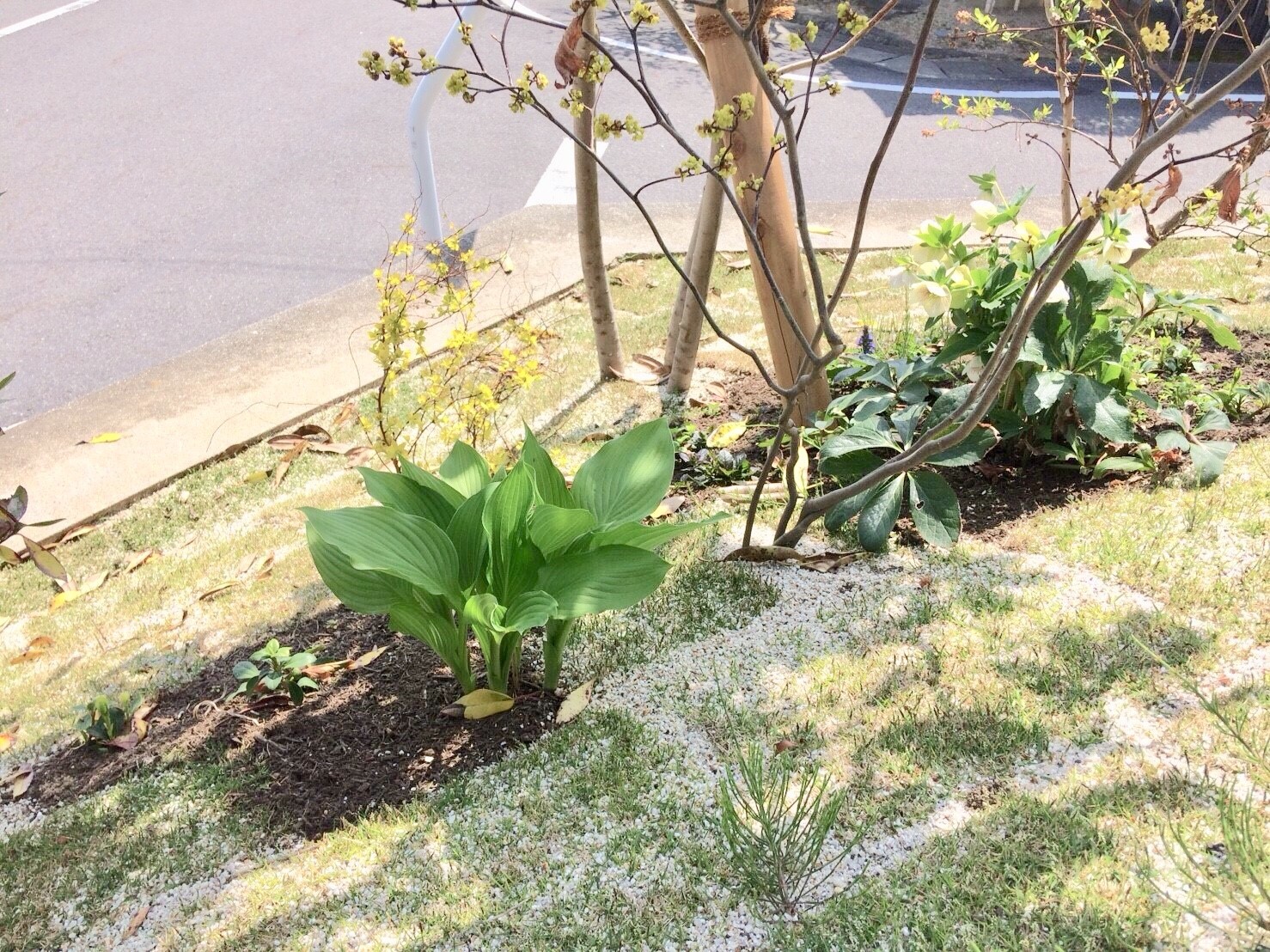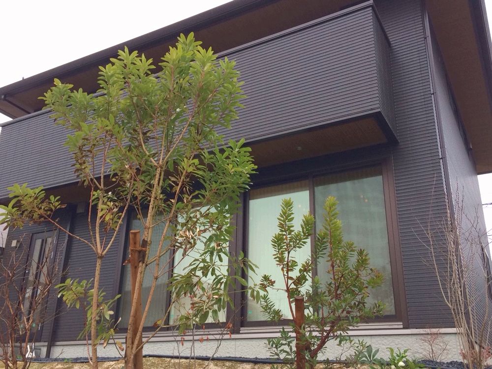 「公道から家の中が見えてしまわないか心配…」とのお悩みには、歩く人の目線の先に樹木を植えて、自然の目隠しとすることで解消しました。