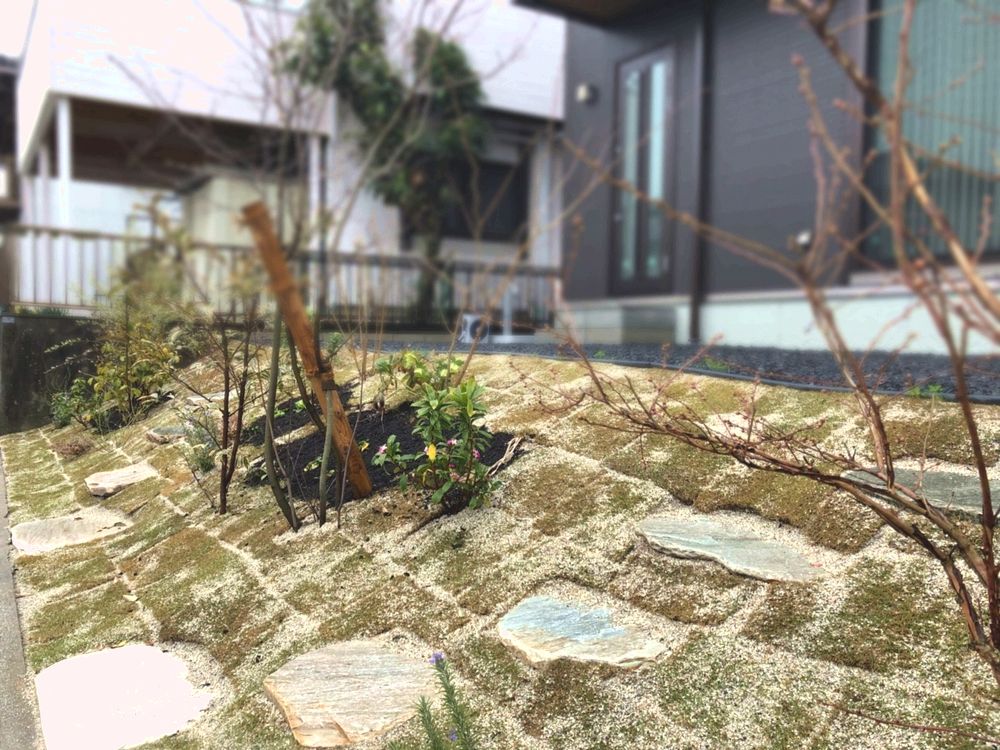 南側に面しているので日当たりが良く、水はけも良い、植栽には最良のお庭となりました。さらに、飛び石を配置したことで今後のお手入れも楽に行えます。